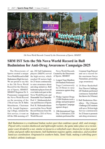10 2025 | Sports Reap Mail | Volume 4 Number 2Ball Badminton is a traditional Indian racket sport that combines speed, skill, and strategy. Played with a woolen shuttlecock and lightweight rackets, the game takes place on a rectangular court divided by a net, similar in layout to a volleyball court. Known for its fast- paced rallies and quick reflex movements, ball badminton requires agility, endurance, and excellent hand-eye coordination. Originated in southern India, Tamil Nadu, making it athrilling sport in India%u2019s athletic landscape.5th Nova World Records Created by the Directorate of Sports, SRMIST.The Directorate of Sports created a unique Nova World Record in Ball Badminton (High Service). We are proud to say this is the 5th Nova World Record for the Directorate of Sports, SRMIST. SRMIST Registrar Dr. S. Ponnusamy inaugurated the Nova World Record on the morning of the 27th at 8 am. Dr. B. Babu Manoharan, Chairman of St. Joseph Engineering College, initiated the first service; it went on till the 28th morning at 9 am. 282 ball badminton players (M&W) served the high service, which reached 20 meters high for 25 hours continuously to raise awareness about anti-drug initiatives. Ball badminton players from all over India took part in this Nova World Record, and Honourable Vice Chancellor Prof. C. Muthamizhchelvan and Director of Sports Prof. R. Mohanakrishnan received the Nova World Record Honours from Mr. Rajkumar, CEO of Nova World Record.Nova World Records Created by the Directorate of Sports, SRMIST1. Longest Yoga Marathon (84 Students Performed Yoga Continuously for 24 Hours to raise awareness against drug abuse)2. Pledge Against Drugs (5,084 Students took a pledge and participated in a Signature Campaign against drugs)3. 10th International Yoga Day Celebration (520 students performed the Common Yoga Protocol and set a record for the maximum Surya Namaskars, promoting yoga awareness)4. 24-Hour Basketball Free Throws Challenge (85 Students performed continuous basketball free throws for 24 hours)5. Ball Badminton Marathon %u2013 The Ultimate Challenge (282 students will serve 20-feet-high Service continuously for 25 hours to promote anti-drug awareness)SRM IST Sets the 5th Nova World Record in Ball Badminton for Anti-Drug Awareness Campaign-2025