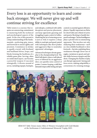 2025 | Sports Reap Mail | Volume 4 Number 2 13Table tennis is a journey that requires an unwavering commitment to mastering both the technical and psychological aspects of the game. At the core of this pursuit is a deep understanding of the fundamentals%u2014perfecting grip, stance, and footwork to ensure agility and precision. Consistency in strokes is equally crucial, with forehand and backhand drives, loops, and blocks forming the backbone of a reliable game plan. Serving, often an underrated aspect, can become a powerful weapon if executed strategically. A diverse arsenal of serves, including topspin, backspin, and sidespin, combined with subtle deception and precise placement, can keep opponents guessing and struggling to gain control of rallies. Mastering the art of returning serves is just as vital; it requires a sharp ability to read spin and speed, paired with techniques like short pushes and aggressive flips to neutralize opponents%u2019 advantages.Advanced techniques elevate gameplay to the championship level. The third-ball attack, where a well-placed serve is followed by an aggressive shot, can quickly seize control of points. Counter-looping, a skill that demands impeccable timing and spin control, is essential against offensive players. Equally important are flicks for short balls and a blend of active and passive blocking to handle fastpaced exchanges. Tactical intelligence plays a pivotal role in outsmarting opponents. This involves not only analysing their weaknesses%u2014such as a less reliable backhand or slow footwork%u2014but also exploiting these weaknesses through clever use of angles, variations in speed, and sudden shifts between topspin and flat shots. Changing the rhythm of play can disrupt opponents%u2019 timing and force errors, making adaptability a cornerstone of a winning strategy.Every loss is an opportunity to learn and come back stronger. We will never give up and will continue striving for excellenceSRM IST Table Tennis teams (Men & Women) triumphed with Gold Medals at the Seethraman & Lakshmiammal Memorial Trophy 2025.