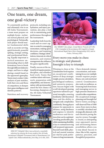 16 2025 | Sports Reap Mail | Volume 4 Number 2One team, one dream, one goal-victoryTo consistently perform and ultimately win in an All-India Tournament, a team must prepare on multiple fronts%u2014technical, tactical, physical, and psychological. Technically, each player should master fundamental skills such as accurate serving, quick footwork, powerful spiking, strategic setting, and synchronized blocking. Equally important is tactical awareness: understanding when to shift formations, how to break through different defensive setups, and how to adapt during a match based on the opponent%u2019s gameplay. Teams must conduct video analysis of past matches, both their own and those of competitors, to sharpen their game intelligence and identify patterns.Nutrition and recovery protocols, including rest, hydration, and injury prevention, also play a vital role in maintaining peak performance throughout the tournament.Leadership-both from the coach and on-court captain-is central to managing momentum, making quick decisions, and inspiring confidence. Strategic substitutions, timeouts at critical moments, and rotation management also influence the game significantly.Finally, success at the national level requires passion, discipline, and relentless hard work. Teams that combine talent with teamwork, preparation with adaptability, and determination with sportsmanship stand the best chance of becoming champions at the All-India Volleyball Tournament.SRM IST Volleyball (Men) team achieved a remarkable milestone by winning the bronze medal at the All-India Invitational Volleyball Tournament held at Thamizhannai Volleyball Club, Peikkarumbankottai, from May 1st to 4th, 2025. Every move you make in chess is strategic and planned; foresight is key to triumphWinning in chess at the Grandmaster level requires an exceptional combination of deep strategic insight, precise calculation, psychological resilience, and extensive preparation. Success begins with a well-developed opening repertoire tailored to personal strengths, ensuring familiarity with theoretical lines and the ability to navigate early complexities confidently. Strong players prepare for opponents in advance, using databases and engines to identify weaknesses and deviations that can be exploited. Avoiding predictable play while maintaining flexibility is key to outmanoeuvring well-prepared opponents. Beyond board skills, physical and mental stamina are vital for peak performance in long tournaments. Chess demands intense concentration, and maintaining focus over multiple rounds requires proper fitness, rest, and emotional control. Grandmasters also work on resilience, as bouncing back from losses and managing nerves in high-pressure situations is crucial in elite competitions. His exceptional strategic planning and foresight led him to victory, securing a well-deserved Prize of 1000 euros. Every move in chess is carefully calculated and strategically planned, with each decision paving the way for victory. Foresight is crucial, as anticipating your opponent%u2019s moves and envisioning future possibilities allows you to stay ahead. Success in chess, like in life, requires patience, precision, and thoughtful preparation.Our SRMIST chess player, Grand Master Pranesh of II- BSc CSE, triumphed at the prestigious 8th Cappelle la Grande International Rapid Open Chess Championship 2025, held in France, February 2025.