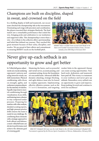2025 | Sports Reap Mail | Volume 4 Number 2 17Never give up-each setback is an opportunity to grow and get betterChampions are built on discipline, shaped in sweat, and crowned on the fieldIn Volleyball game adjustments are crucial; analysing opponents%u2019 patterns and using timeouts wisely can shift momentum. Physical conditioning, with a focus on strength, agility, and endurance, prepares players for the intensity of matches. Equally important is mental conditioning through visualization, focus drills, and fostering team cohesion to stay composed under pressure. Preparing for matches with video analysis, detailed scouting reports, and high-pressure practice drills ensures the team is ready for any challenge. By combining these elements with a strategic approach to both offense and defence, a men%u2019s volleyball team can elevate its performance and achieve the ultimate goal of winning gold.In a thrilling display of skill and teamwork, our soccer team clinched the championship title at the tournament. Dominating each stage with precision and coordination, the players executed their strategies flawlessly. The final match saw a remarkable performance that sealed the win, bringing pride and celebration to our institution and supporters alike. This championship is more than a win%u2014it%u2019s a tribute to the collective effort, sportsmanship, and belief that defined our journey. They reached this great moment because of their unity, discipline, and resolve. We are proud of their efforts and commitment to ensuring SRMIST excels on the football pitch.SRM IST Volleyball (M) team won the Gold Medal in the All-India Invitational Volleyball (M) Tournament organized by the Worora Sports Foundation in Worora, Maharashtra, February 2025.Mastering the basics, such as powerful and varied serves, accurate passing, and consistent setting, forms the foundation of a successful team. Advanced skills like dynamic attacking, strategic blocking, and agile defence must also be honed to outplay opponents. Implementing effective offensive systems, such as the 5-1 or 6-2 formations, and targeting weaker links in the opponent%u2019s lineup can create scoring opportunities. Your hard work, dedication, and teamwork have paid off. This victory is a testament to your resilience and never-give-up attitude. Remember, every setback was an opportunity to grow and improve. Keep pushing forward and continue to strive for excellence!SRMIST Men%u2019s Football Team secured Gold Medal at the State Level Football Tournament held at Arani, Tiruvannamalai, from 30th May to 01st June 2025