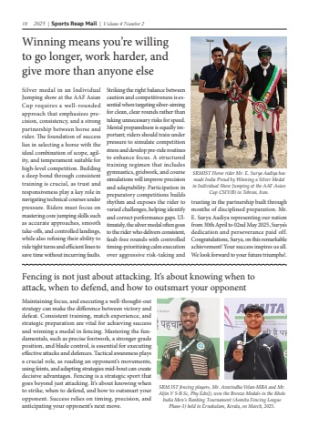 18 2025 | Sports Reap Mail | Volume 4 Number 2Fencing is not just about attacking. It%u2019s about knowing when to attack, when to defend, and how to outsmart your opponentMaintaining focus, and executing a well-thought-out strategy can make the difference between victory and defeat. Consistent training, match experience, and strategic preparation are vital for achieving success and winning a medal in fencing. Mastering the fundamentals, such as precise footwork, a stronger grade position, and blade control, is essential for executing effective attacks and defences. Tactical awareness plays a crucial role, as reading an opponent%u2019s movements, using feints, and adapting strategies mid-bout can create decisive advantages. Fencing is a strategic sport that goes beyond just attacking. It%u2019s about knowing when to strike, when to defend, and how to outsmart your opponent. Success relies on timing, precision, and anticipating your opponent%u2019s next move.SRM IST fencing players, Mr. Aravindha Velan-MBA and Mr. Aljin V S-B.Sc, Phy Edn]), won the Bronze Medals in the Khelo India Men%u2019s Ranking Tournament (Asmita Fencing League Phase-3) held in Ernakulam, Kerala, on March, 2025.Silver medal in an Individual Jumping show at the AAF Asian Cup requires a well-rounded approach that emphasizes precision, consistency, and a strong partnership between horse and rider. The foundation of success lies in selecting a horse with the ideal combination of scope, agility, and temperament suitable for high-level competition. Building a deep bond through consistent training is crucial, as trust and responsiveness play a key role in navigating technical courses under pressure. Riders must focus on mastering core jumping skills such as accurate approaches, smooth take-offs, and controlled landings, while also refining their ability to ride tight turns and efficient lines to save time without incurring faults.Striking the right balance between caution and competitiveness is essential when targeting silver-aiming for clean, clear rounds rather than taking unnecessary risks for speed. Mental preparedness is equally important; riders should train under pressure to simulate competition stress and develop pre-ride routines to enhance focus. A structured training regimen that includes gymnastics, gridwork, and course simulations will improve precision and adaptability. Participation in preparatory competitions builds rhythm and exposes the rider to varied challenges, helping identify and correct performance gaps. Ultimately, the silver medal often goes to the rider who delivers consistent, fault-free rounds with controlled timing-prioritizing calm execution over aggressive risk-taking and Winning means you%u2019re willing to go longer, work harder, and give more than anyone elsetrusting in the partnership built through months of disciplined preparation. Mr. E. Surya Aadiya representing our nation from 30th April to 02nd May 2025, Surya%u2019s dedication and perseverance paid off. Congratulations, Surya, on this remarkable achievement! Your success inspires us all. We look forward to your future triumphs!.SRMIST Horse rider Mr. E. Surya Aadiya has made India Proud by Winning a Silver Medal in Individual Show Jumping at the AAF Asian Cup CSIY(B) in Tehran, Iran.