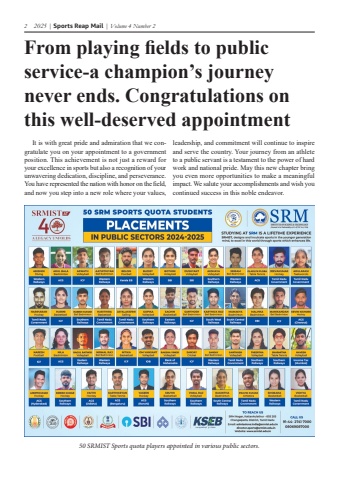 2 2025 | Sports Reap Mail | Volume 4 Number 2From playing fields to public service-a champion%u2019s journey never ends. Congratulations on this well-deserved appointmentIt is with great pride and admiration that we congratulate you on your appointment to a government position. This achievement is not just a reward for your excellence in sports but also a recognition of your unwavering dedication, discipline, and perseverance. You have represented the nation with honor on the field, and now you step into a new role where your values, leadership, and commitment will continue to inspire and serve the country. Your journey from an athlete to a public servant is a testament to the power of hard work and national pride. May this new chapter bring you even more opportunities to make a meaningful impact. We salute your accomplishments and wish you continued success in this noble endeavor.50 SRMIST Sports quota players appointed in various public sectors.