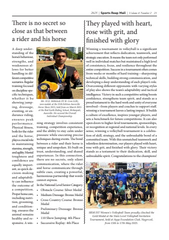 2025 | Sports Reap Mail | Volume 4 Number 2 21There is no secret so close as that between a rider and his horseA deep understanding of the horse%u2019s behaviour, strengths, and weaknesses allows for better handling in different competitive scenarios. Regular training focused on discipline-specific techniques, whether it be showing jumping, dressage, eventing, or endurance riding, ensures peak performance. Physical fitness, both for the rider and the horse, plays a crucial role in maintaining stamina, strength, and agility. Mental toughness and confidence are equally important, as quick decision-making and adaptability can influence the outcome of a competition. Proper horse care, including nutrition, grooming, and conditioning, ensures the animal remains healthy and responsive. A winning strategy involves consistent training, competition experience, and the ability to stay calm under pressure while executing precise techniques during events. The bond between a rider and their horse is unique and unspoken. It%u2019s built on trust, understanding, and shared experiences. In this connection, there are no secrets, only silent communication, where the rider and horse communicate through subtle cues, creating a powerful, harmonious partnership that words cannot express.In the National Level Senior Category.%u2022 Obstacle Course: Silver Medal%u2022 Medium Dressage: Bronze Medal%u2022 Cross Country Course: Bronze Medal%u2022 Preliminary Dressage: Bronze Medal%u2022 110 Show Jumping: 4th Place%u2022 Successive Replay: 4th PlaceMr. H.U. Mithilesh (IV-B. Com LLB), won medals at the 25th Edition Auroville Horse Show 2025, held from on March 2025 at the Red Earth Riding School, Brihaspati, Auroville. He secured the Overall Individual Championship.They played with heart, rose with grit, and finished with gloryWinning a tournament in volleyball is a significant achievement that reflects dedication, teamwork, and strategic execution. It means the team not only performed well in individual matches but maintained a high level of consistency, focus, and resilience throughout the entire competition. Success in a tournament often comes from weeks or months of hard training%u2014sharpening technical skills, building strong communication, and developing a deep understanding of each player%u2019s role. Overcoming different opponents with varying styles of play also shows the team%u2019s adaptability and tactical intelligence. Victory in such a competitive setting boosts confidence, strengthens team spirit, and stands as a proud testament to the hard work and unity of everyone involved%u2014from players and coaches to support staff. winning a tournament leaves a lasting impact. It builds a culture of excellence, inspires younger players, and sets a benchmark for future competitions. It can also open doors to higher-level tournaments, sponsorships, or recognition at regional and national levels. In every sense, winning a volleyball tournament is a celebration of skill, strategy, and the unbreakable bond of a committed team. With this unmatched teamwork and relentless determination, our players played with heart, rose with grit, and finished with glory. Their victory stands as a testament to their dedication, skill, and unbreakable spirit. Congratulations to the champions!SRM IST Women%u2019s Volleyball Team proudly clinched the Gold Medal at the State Level Volleyball Invitation Tournament, held at Ayya Foundation Club, Nagercoil, from 15th to 17th May 2025.