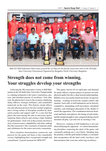 2025 | Sports Reap Mail | Volume 4 Number 2 3Strength does not come from winning. Your struggles develop your strengthsAchieving the 4th consecutive victory in Ball Badminton at the All-India Inter University Championship is a shining testament to the team%u2019s consistency, passion, and relentless pursuit of excellence. Year after year, the players have risen to the occasion, displaying sharp reflexes, strategic brilliance, and remarkable teamwork on the court. This historic streak reflects not only physical prowess but also mental toughness and a strong culture of discipline instilled by dedicated coaches and support staff. It%u2019s a rare feat that places the team among the elite in university sports, inspiring future players and setting a high standard for performance. Each win in this journey has been a story of perseverance, adaptability, and unity, making this 4th consecutive title a moment of immense pride and celebration for the entire university community.Their relentless determination, teamwork, and passion for the game led them to this remarkable victory, highlighting their exceptional strength and commitment. A proud moment for SRM IST! This game, known for its rapid pace and demand for quick reflexes, requires players to possess not only physical agility but also a deep tactical understanding. Behind every successful match lies hours of rigorous training%u2014working on footwork, racquet control, and stamina. Each rally in ball badminton can be fiercely competitive, demanding swift movement, calculated smashes, and intelligent placement of the shuttle to outwit the opposition. The coordination between frontcourt and back-court players, the timing of each stroke, and the mental strength to stay composed during crucial moments all play a pivotal role in securing a win.Moreover, winning in ball badminton is not just about defeating the opponent%u2014it%u2019s about demonstrating discipline, respecting the spirit of the game, and constantly pushing one%u2019s own limits. Standing atop the podium, with the gold medal in hand, is a moment that encapsulates all the hard work, sacrifices, and determination that went into achieving excellence.SRM IST Ball badminton Men%u2019s team secured the 1st Place for the fourth consecutive time in the All India Inter University Tournament Organized by Bangalore North University, Bangalore.