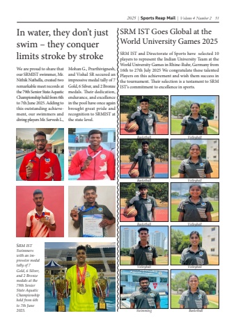 2025 | Sports Reap Mail | Volume 4 Number 2 31In water, they don%u2019t just swim %u2013 they conquer limits stroke by strokeWe are proud to share that our SRMIST swimmer, Mr. Nithik Nathella, created two remarkable meet records at the 79th Senior State Aquatic Championship held from 6th to 7th June 2025. Adding to this outstanding achievement, our swimmers and diving players Mr. Servesh L., Mohan G., Prarthivignesh, and Vishal SR secured an impressive medal tally of 7 Gold, 6 Silver, and 2 Bronze medals. Their dedication, endurance, and excellence in the pool have once again brought great pride and recognition to SRMIST at the state level.SRM IST Goes Global at the World University Games 2025SRM IST and Directorate of Sports have selected 10 players to represent the Indian University Team at the World University Games in Rhine-Ruhr, Germany from 16th to 27th July 2025 We congratulate these talented Players on this achievement and wish them success in the tournament. Their selection is a testament to SRM IST%u2019s commitment to excellence in sports.SRM IST Swimmers with an impressive medal tally of 7 Gold, 6 Silver, and 2 Bronze medals at the 79th Senior State Aquatic Championship held from 6th to 7th June 2025.BasketballBasketballBasketballVolleyballSwimmingVolleyballVolleyballVolleyballVolleyballBasketball