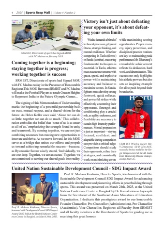 4 2025 | Sports Reap Mail | Volume 4 Number 2Coming together is a beginning; staying together is progress; working together is successSRM IST, Directorate of sports had Signed MOU with FC Madras today in the Presence of Honourable Registrar.This MOU Between SRMIST and FC Madras will make the Football Players to reach Greater Heights to Represent India in the Future Olympic Games...The signing of this Memorandum of Understanding marks the beginning of a powerful partnership built on trust, mutual respect, and a shared vision for the future. As Helen Keller once said, %u2018Alone we can do so little; together we can do so much.%u2019 This collaboration embodies the belief that %u2018none of us is as smart as all of us,%u2019 emphasizing the strength found in unity and teamwork. By coming together, we are not just combining resources but creating new opportunities to innovate and thrive. As we move forward, let this MOU serve as a bridge that unites our efforts and propels us toward achieving remarkable success%u2014because, as Ryunosuke Satoro wisely stated, %u2018Individually, we are one drop. Together, we are an ocean.%u2019 Together, we are committed to turning our shared goals into reality.SRM IST, Directorate of sports has Signed MOU with FC Madras on february 2025.United Nation Sustainable Development Council - SDG Impact AwardProf. R. Mohana Krishnan, Director Sports, was honoured with the Sustainable Development Council SDG Impact Award for advancing sustainable development and pioneering efforts in peacebuilding through sports. This award was presented on March 24th, 2025, at the United Nations Conference Centre in Bangkok by Dr. Kamaleswaran Jayarajah from the Secretariat of the Southeast Asian Ministries of Education Organization. I dedicate this prestigious award to our honourable Founder Chancellor, Pro Chancellor (Administration), Pro Chancellor (Academics), Vice Chancellor, Registrar, all Faculty from SRMIST and all faculty members in the Directorate of Sports for guiding me in receiving this great honour.Prof. R. Mohana Krishnan, Director Sports, honoured with Development Council SDG Impact Award-2025, held at the United Nations Conference Centre in Bangkok, on March 24th, 2025.Victory isn%u2019t just about defeating your opponent, it%u2019s about defeating your own limitsWushu demands a blend of technical precision, physical fitness, strategic thinking, and mental resilience. Whether competing in Taolu (forms) or Sanda (combat), mastering fundamental techniques is essential. In Taolu, athletes must execute movements with grace, speed, and explosive power while maintaining accuracy and balance to maximize scores. In Sanda, fighters must develop strong footwork, quick reflexes, and powerful strikes while effectively countering their opponents. Strength and conditioning play a crucial role, as agility, endurance, and flexibility are necessary to sustain high-intensity performances. Mental preparation is just as important%u2014staying focused, confident, and adaptable during competition can provide a critical edge. Competitors should study their opponents, refine their strategies, and consistently work on minimizing errors SRM IST Wushu player Mr. V.Dharunraj -III-B-Com A&F, secured a bronze medal in the Single Weapon event at the All-India Inter-University Wushu Championship 2024-25.while maximizing scoring opportunities. Proper recovery, injury prevention, and disciplined practice routines are key to maintaining peak performance.Mr. Dharunraj%u2019s remarkable achievement reflects his dedication, hard work, and determination. This success not only highlights his athletic prowess but also sets an inspiring example for all to push beyond their boundaries.