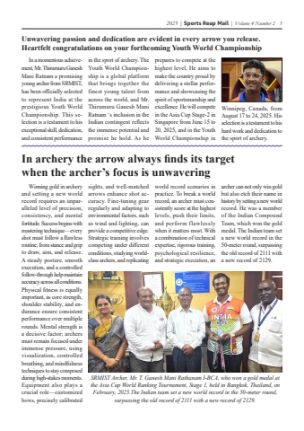 2025 | Sports Reap Mail | Volume 4 Number 2 5In archery the arrow always finds its target when the archer%u2019s focus is unwaveringWinning gold in archery and setting a new world record requires an unparalleled level of precision, consistency, and mental fortitude. Success begins with mastering technique%u2014every shot must follow a flawless routine, from stance and grip to draw, aim, and release. A steady posture, smooth execution, and a controlled follow-through help maintain accuracy across all conditions. Physical fitness is equally important, as core strength, shoulder stability, and endurance ensure consistent performance over multiple rounds. Mental strength is a decisive factor; archers must remain focused under immense pressure, using visualization, controlled breathing, and mindfulness techniques to stay composed during high-stakes moments. Equipment also plays a crucial role%u2014customized bows, precisely calibrated SRMIST Archer, Mr. T. Ganesh Mani Rathanam I-BCA, who won a gold medal at the Asia Cup World Ranking Tournament, Stage 1, held in Bangkok, Thailand, on February, 2025.The Indian team set a new world record in the 50-meter round, surpassing the old record of 2111 with a new record of 2129.sights, and well-matched arrows enhance shot accuracy. Fine-tuning gear regularly and adapting to environmental factors, such as wind and lighting, can provide a competitive edge. Strategic training involves competing under different conditions, studying worldclass archers, and replicating world record scenarios in practice. To break a world record, an archer must consistently score at the highest levels, push their limits, and perform flawlessly when it matters most. With a combination of technical expertise, rigorous training, psychological resilience, and strategic execution, an archer can not only win gold but also etch their name in history by setting a new world record. He was a member of the Indian Compound Team, which won the gold medal. The Indian team set a new world record in the 50-meter round, surpassing the old record of 2111 with a new record of 2129.Unwavering passion and dedication are evident in every arrow you release. Heartfelt congratulations on your forthcoming Youth World ChampionshipIn a momentous achievement, Mr. Thirumuru Ganesh Mani Ratnam a promising young archer from SRMIST, has been officially selected to represent India at the prestigious Youth World Championship. This selection is a testament to his exceptional skill, dedication, and consistent performance in the sport of archery. The Youth World Championship is a global platform that brings together the finest young talent from across the world, and Mr. Thirumuru Ganesh Mani Ratnam %u2018s inclusion in the Indian contingent reflects the immense potential and promise he hold. As he prepares to compete at the highest level, He aims to make the country proud by delivering a stellar performance and showcasing the spirit of sportsmanship and excellence. He will compete in the Asia Cup Stage-2 in Singapore from June 15 to 20, 2025, and in the Youth World Championship in Winnipeg, Canada, from August 17 to 24, 2025. His selection is a testament to his hard work and dedication to the sport of archery.