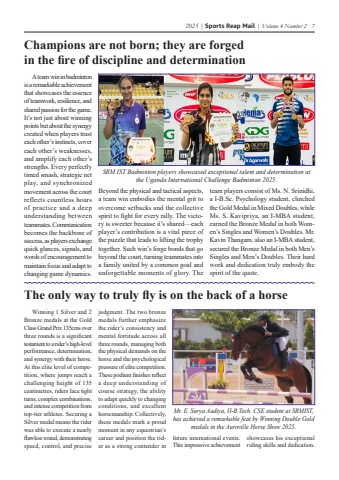 2025 | Sports Reap Mail | Volume 4 Number 2 7A team win in badminton is a remarkable achievement that showcases the essence of teamwork, resilience, and shared passion for the game. It%u2019s not just about winning points but about the synergy created when players trust each other%u2019s instincts, cover each other%u2019s weaknesses, and amplify each other%u2019s strengths. Every perfectly timed smash, strategic net play, and synchronized movement across the court reflects countless hours of practice and a deep understanding between teammates. Communication becomes the backbone of success, as players exchange quick glances, signals, and words of encouragement to maintain focus and adapt to changing game dynamics. Winning 1 Silver and 2 Bronze medals at the Gold Class Grand Prix 135cms over three rounds is a significant testament to a rider%u2019s high-level performance, determination, and synergy with their horse. At this elite level of competition, where jumps reach a challenging height of 135 centimetres, riders face tight turns, complex combinations, and intense competition from top-tier athletes. Securing a Silver medal means the rider was able to execute a nearly flawless round, demonstrating speed, control, and precise judgment. The two bronze medals further emphasize the rider%u2019s consistency and mental fortitude across all three rounds, managing both the physical demands on the horse and the psychological pressure of elite competition. These podium finishes reflect a deep understanding of course strategy, the ability to adapt quickly to changing conditions, and excellent horsemanship. Collectively, these medals mark a proud moment in any equestrian%u2019s career and position the rider as a strong contender in Champions are not born; they are forged in the fire of discipline and determinationThe only way to truly fly is on the back of a horseSRM IST Badminton players showcased exceptional talent and determination at the Uganda International Challenge Badminton 2025.Mr. E. Surya Aadiya, II-B.Tech. CSE student at SRMIST, has achieved a remarkable feat by Winning Double Gold medals in the Auroville Horse Show 2025.Beyond the physical and tactical aspects, a team win embodies the mental grit to overcome setbacks and the collective spirit to fight for every rally. The victory is sweeter because it%u2019s shared%u2014each player%u2019s contribution is a vital piece of the puzzle that leads to lifting the trophy together. Such win%u2019s forge bonds that go beyond the court, turning teammates into a family united by a common goal and unforgettable moments of glory. The team players consist of Ms. N. Srinidhi, a I-B.Sc. Psychology student, clinched the Gold Medal in Mixed Doubles, while Ms. S. Kavipriya, an I-MBA student, earned the Bronze Medal in both Women%u2019s Singles and Women%u2019s Doubles. Mr. Kavin Thangam, also an I-MBA student, secured the Bronze Medal in both Men%u2019s Singles and Men%u2019s Doubles. Their hard work and dedication truly embody the spirit of the quote.future international events. This impressive achievement showcases his exceptional riding skills and dedication.
