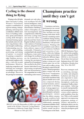 8 2025 | Sports Reap Mail | Volume 4 Number 2Champions practice until they can%u2019t get it wrongConsistency and structured practice are crucial for winning the tournament. This includes not only honing individual skills but also simulating match conditions during training to build confidence and familiarity with pressure scenarios. Working with a qualified coach allows for continuous feedback and correction of mistakes, while also helping in devising tactical plans tailored to different stages of the tournament. Developing a strong serve and return game can set the tone early in rallies, giving the player control from the outset. Mental preparation plays a major role at the elite level. Visualization techniques, mindfulness, and match simulation help players handle nerves and stay composed during crucial moments, such as game points or deciding sets. A strong support system%u2014including coaches, physiotherapists, and sports psychologists%u2014ensures that the athlete remains in peak condition both physically and emotionally. Additionally, managing tournament schedules wisely and conserving energy in earlier rounds can prove advantageous in the finals. SRM IST Badminton Player Ms. Aalisha Naik exemplifies this spirit, winning the GOLD MEDAL in the Kawasaki Slovak Open International Badminton Series 2025. Held in Bratislava, Slovakia, from May 7th to 10th 2025.Recovery strategies such as stretching, massage, ice baths, and adequate hydration and sleep are also important to maintain peak performance throughout a multi-day tournament. Finally, a champion mindset%u2014believing in oneself, staying humble, and remaining hungry for victory-often separates gold medallists from the rest. With a well-rounded approach encompassing preparation, strategy, resilience, and passion, a badminton player can rise above the competition and claim the prestigious gold medal.Cycling is the closest thing to flyingWinning in the All-India Inter-University Cycling Women%u2019s Tournament requires a combination of rigorous training, strategic planning, and strong team coordination. Athletes must focus on building endurance, speed, and technical cycling skills through a structured training regime that includes interval workouts, long-distance rides, and strength conditioning. Understanding race dynamics%u2014such as drafting, positioning, and timing of sprints%u2014is essential for gaining a competitive edge. Nutrition, recovery, and mental toughness also play a vital role in peak performance. Moreover, analyzing competitors and tailoring race strategies accordingly can give riders an advantage. Success in this prestigious tournament demands not only physical excellence but also tactical intelligence, team synergy, and unwavering determination. Building a culture of discipline, mutual encouragement, and competitiveness within the university cycling team can motivate riders to push beyond their limits. Regular feedback sessions, video analysis of training and races, and goal reviews help athletes improve continually. Ultimately, consistent hard work, tactical intelligence, team unity, and a hunger for excellence are the foundation for winning this prestigious national-level tournament. She excelled in the 40-kilometer Individual Event, showcasing exceptional skill and determination. We congratulate her on this outstanding achievement.SRM IST cyclist Ms.Dhanyadha of I-BBA won a gold medal in the All-Inter University Cycling Women%u2019s Tournament at Maharaja Ganga Singh University, Bikaner on 10th April 2025.
